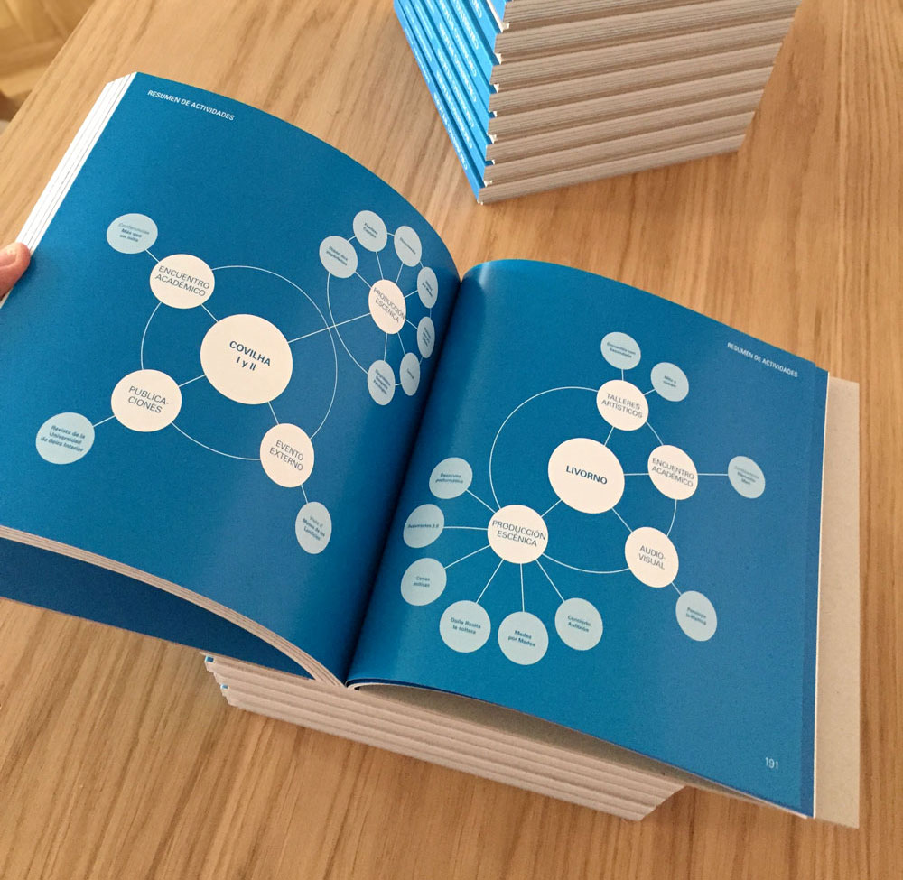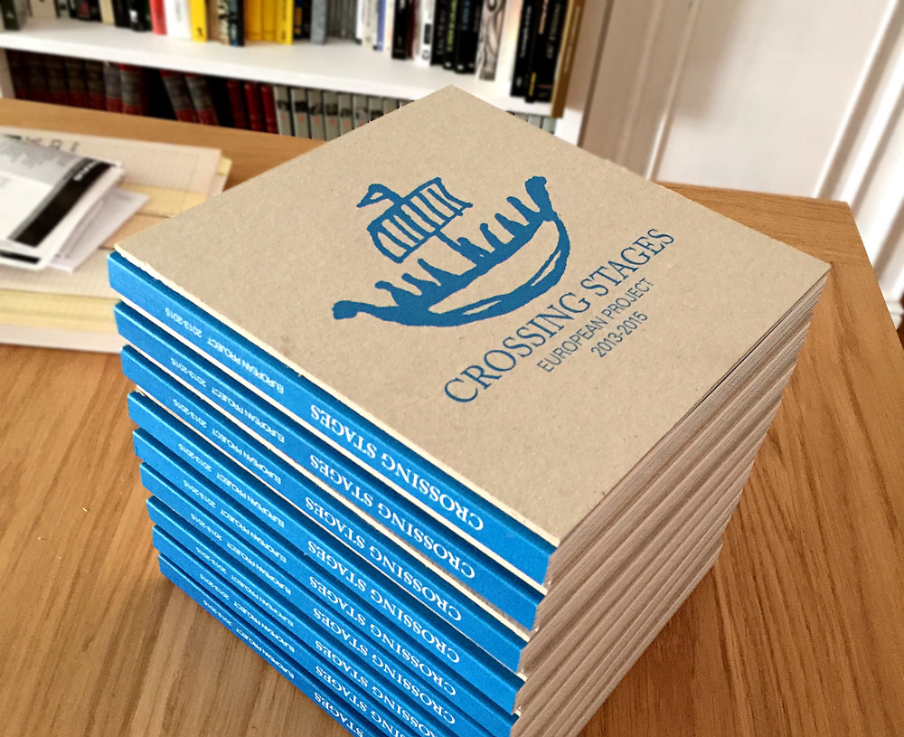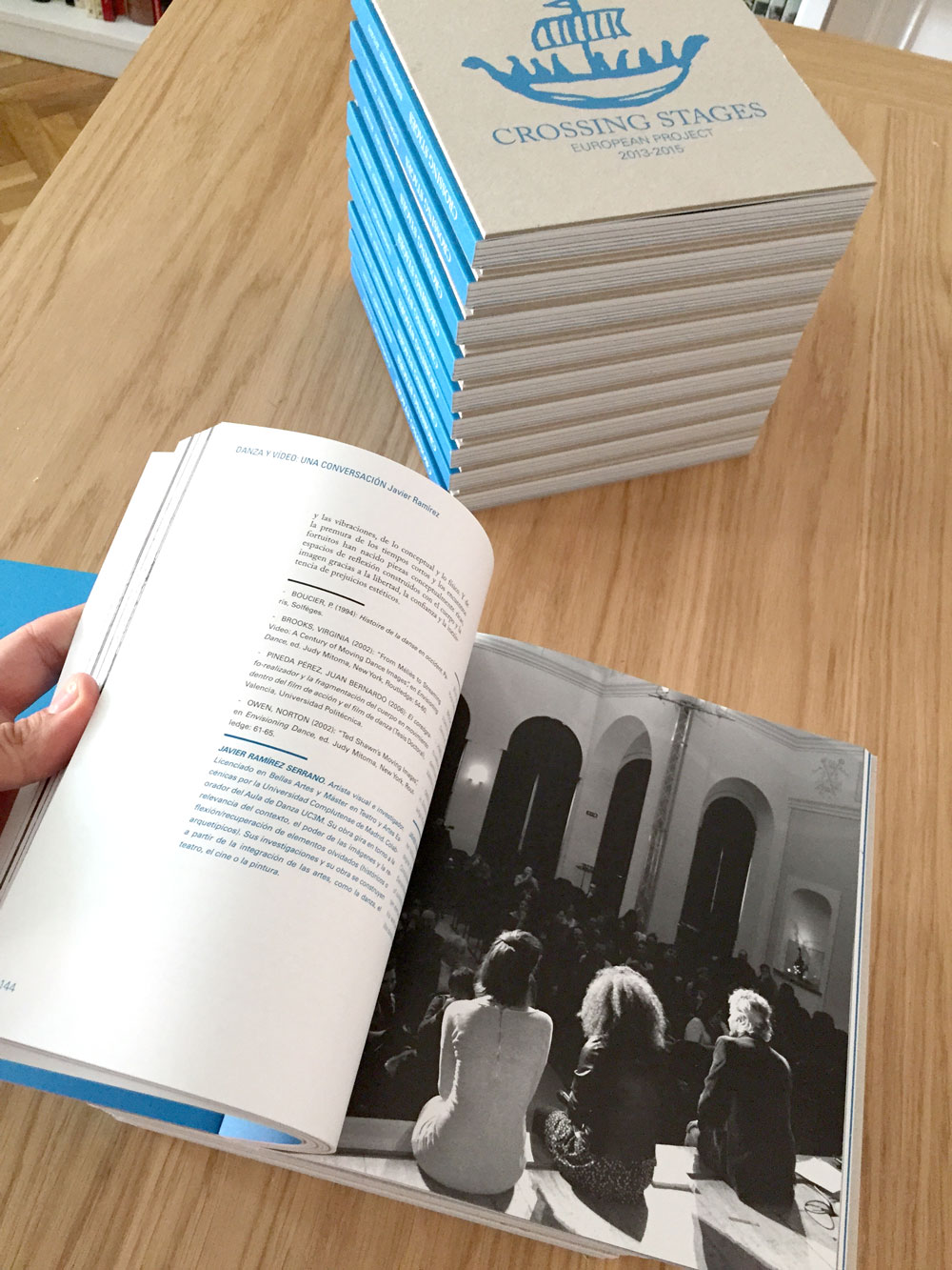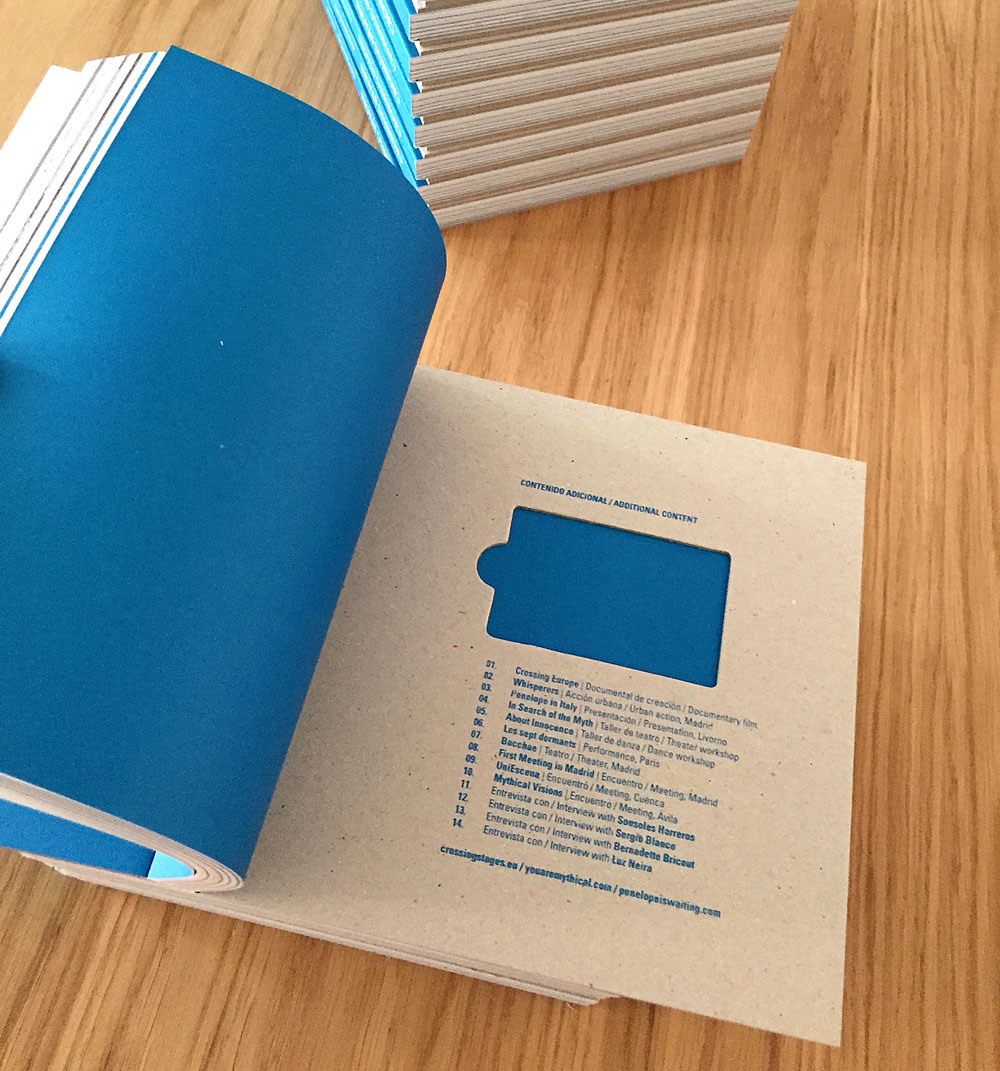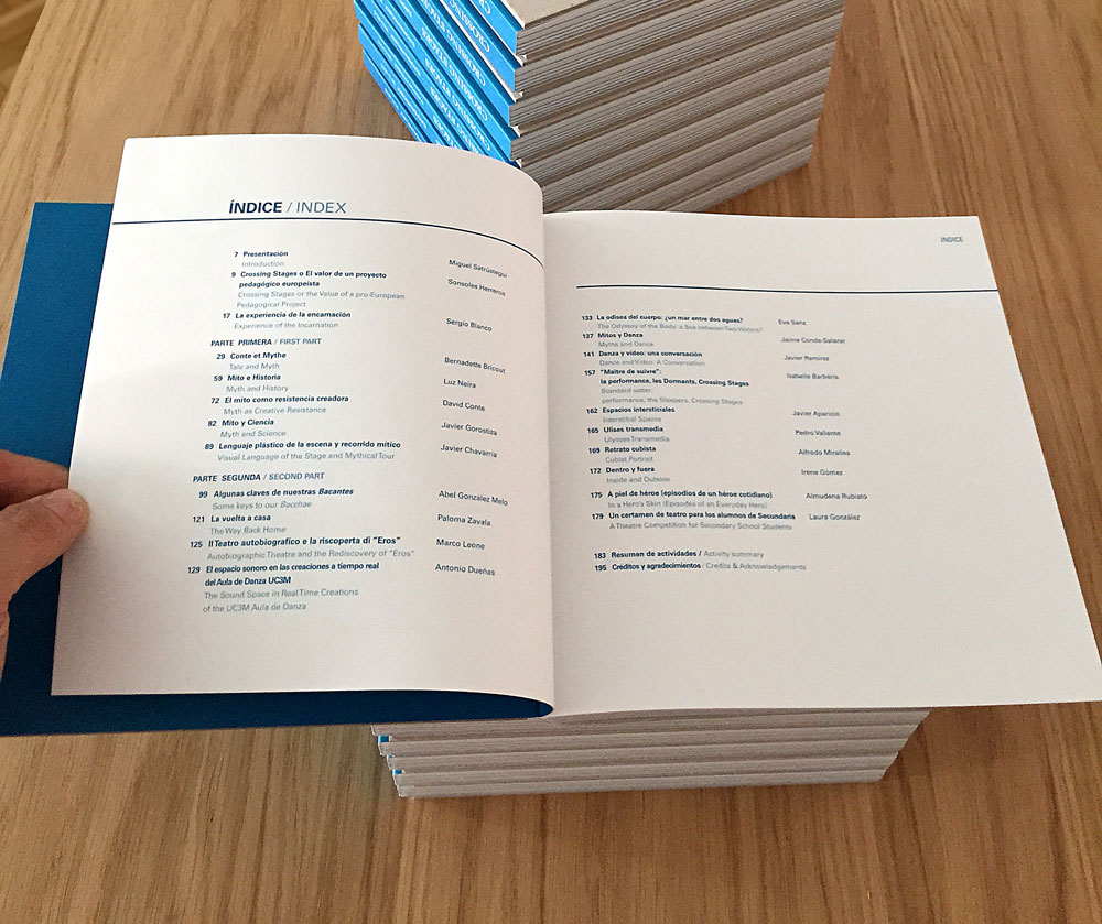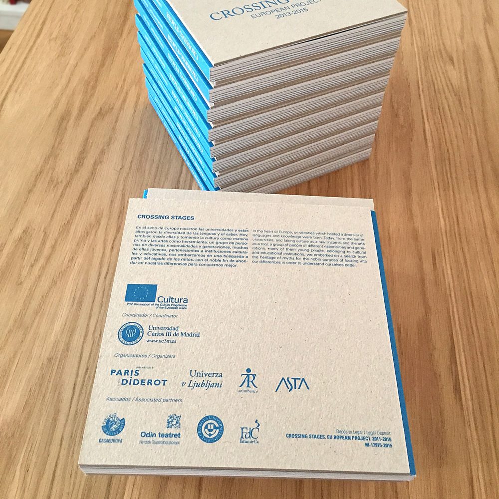 Encargo de libro resumen de la actividad desarrollada durante 2 años dentro del proyecto Crossing Stages gestionado por el Aula de las Artes de la UC3M. El concepto con el que jugábamos era materializar el espíritu detrás de este proyecto internacional y transversal de investigación escénica. Con unas cubiertas hechas de cartoncillo de 0,5mm serigrafiadas a una tinta buscamos obtener un volumen extra en el libro que, sin aumentar el presupuesto, aportara la fisicidad, el sentido del tacto y la calidez como respuesta al briefing. La tercera de cubierta además contiene un USB extraplano con los vídeos realizados en el transcurso del proyecto. El libro funciona al mismo tiempo como un contendor de material audiovisual resultado del proyecto. La cubierta contiene la logomarca de Crossing Stages, creada por Jacobo Pérez Enciso.