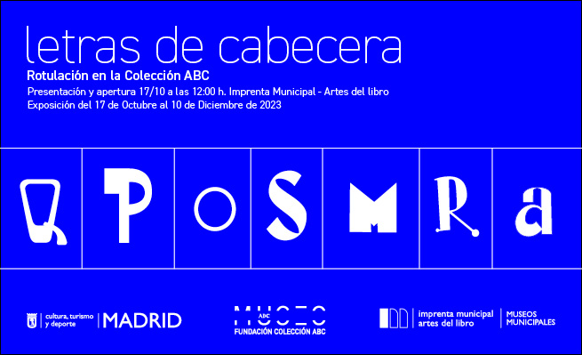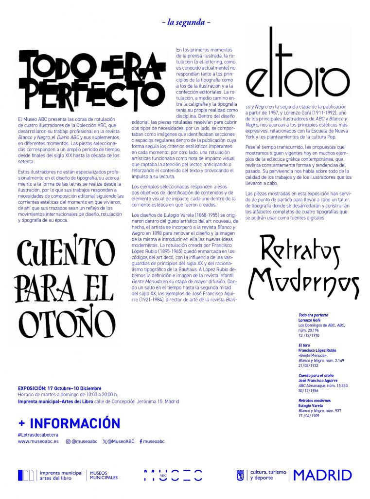 2023. El Museo ABC, en colaboración con la Imprenta Municipal – Artes del Libro, presenta las obras de rotulación de cuatro ilustradores de la Colección ABC, que desarrollaron su trabajo profesional en la revista Blanco y Negro, el Diario ABC y sus suplementos en un periodo de tiempo desde finales del siglo XIX hasta la década de los setenta. Estos ilustradores no están especializados profesionalmente en el diseño de tipografía, su acercamiento a la forma de las letras se realiza desde la ilustración, por lo que sus trabajos responden a necesidades de composición editorial siguiendo las corrientes estéticas del momento en que vivieron.